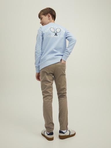 Otroške fantovske modne chino hlače blagovne znamke JACK&JONES JUNIOR, regular kroj, z dvema žepoma na straneh in dvema prešitima žepoma zadaj, z zankami za pas, iz prijetnega bombaža, slim kroj. Material: 50% ekološki bombaž, 28% bombaž, 20% recikliran bombaž, 2% elastan