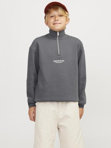 Otroški fantovski kosmaten pulover brez kapuce blagovne znamke JACK&JONES JUNIOR, z visokim ovratnikom in z zadrgo za odpiranje spredaj, s potiskom spredaj, z mehkim rebrastim patentom na zaključkih, lahko širši kroj s spuščenimi rameni, kosmaten material, dolg rokav. Material: 70% bombaž, 30% poliester