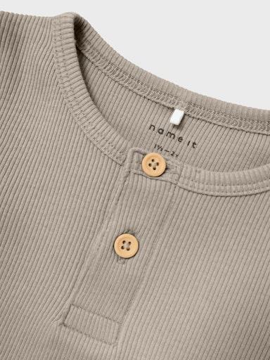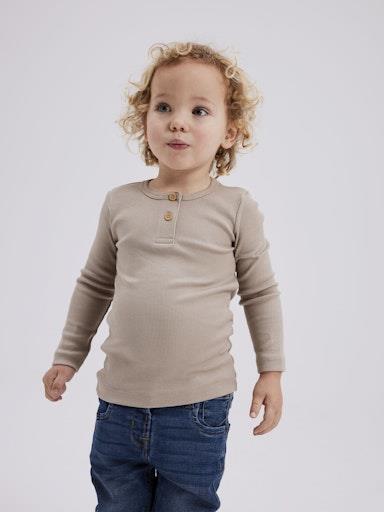 Otroška fantovska majica iz prijetnega rebrastega materiala, z dvema gumboma spredaj, regular kroj, dolg rokav. Material: 57% ekološki bombaž, 38% modal, 5% elastan