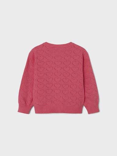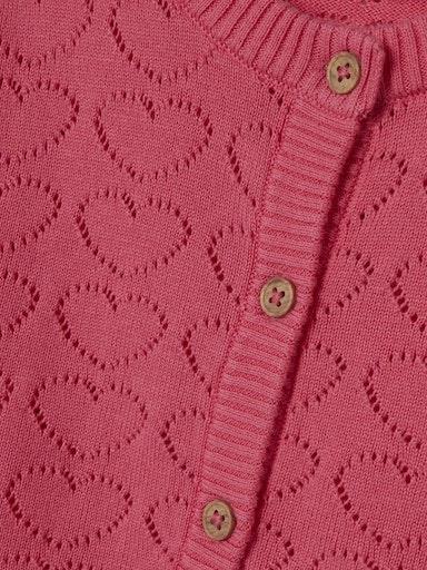 Otroška dekliška modna pletena jopa, iz prijetnega in udobnega ekološkega bombaža, s prikupnim all over luknjičastim vzorcem, z mehkimi rebrastimi zaključki, zapenjanje na gumbe, regular kroj, dolg rokav. Material: 100% ekološki bombaž
