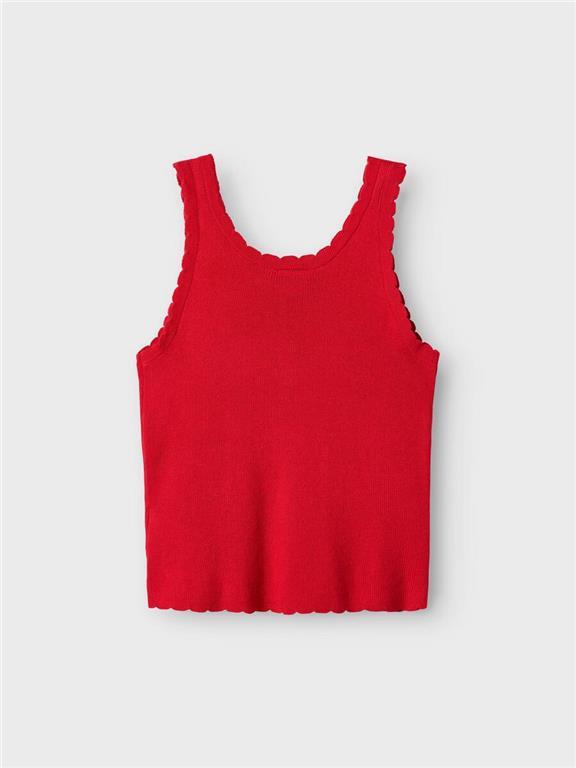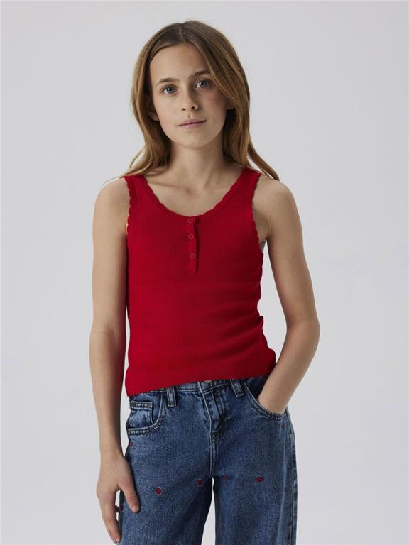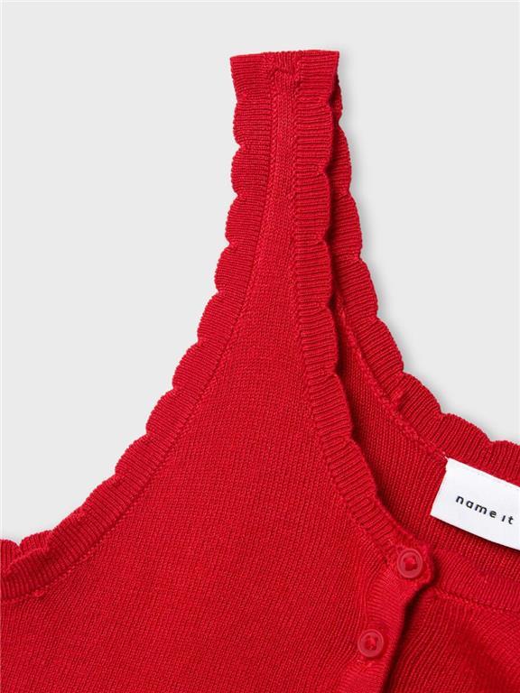 Otroška dekliška modna in udobna majica iz fine in mehke pletenine, z gumbki spredaj, z valovito zaključenimi robovi, krajši kroj, brez rokavov. Material: 80% LENZING™ ECOVERO™ viskoza, 20% najlon