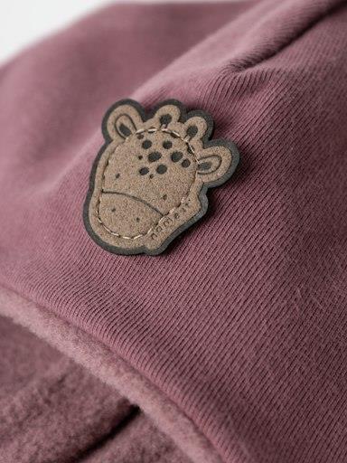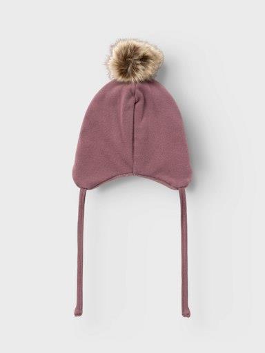 Otroška pletena zimska kapa a cofom iz umetnega krzna, z dekorativnim našitkom spredaj, s podaljšanim delom pri ušesih, toplo podložena s flisom, zavezovanje s trakovi. Material: zunaj: 95% bombaž, 5% elastan; znotraj: 100% poliester. Velikosti: 34/39: 0-2 meseca, 40/44: 2-6 mesecev, 45/47: 6-9 mesecev.