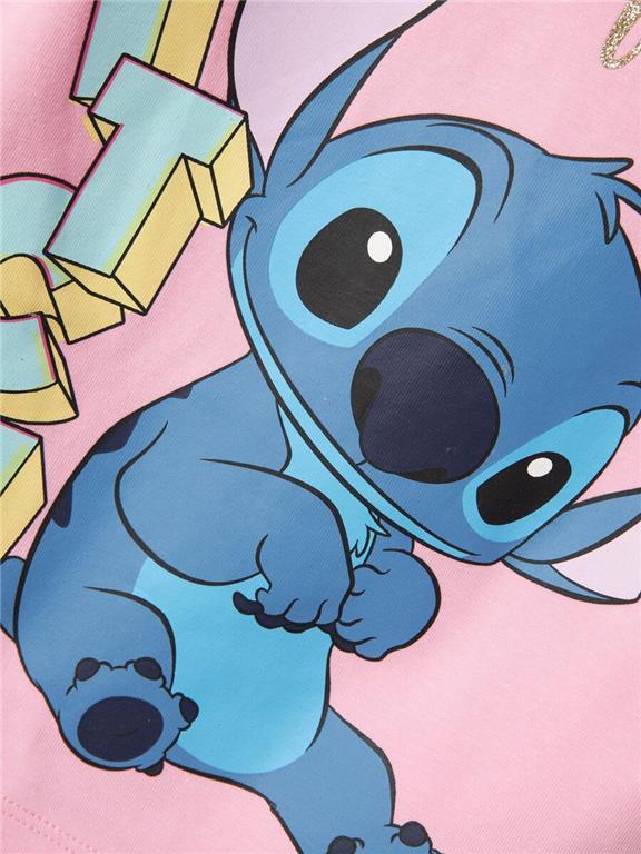 Otroška dekliška majica s prikupnim licenčnim potiskom priljubljenega Stitch-a, z bleščičastimi detajli, rahlo nabrana na ramenih, regular kroj, kratek rokav. Material: 95% bombaž, 5% elastan