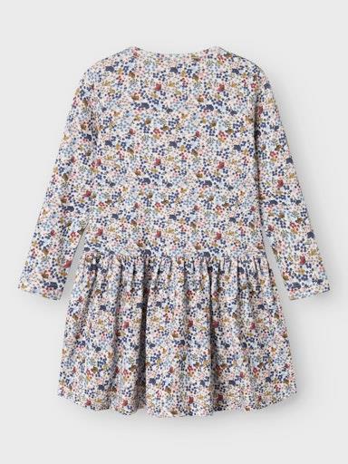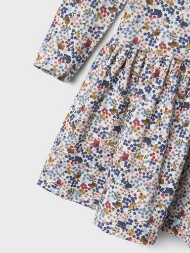 Otroška dekliška obleka z all over vzorcem, iz prijetnega in udobnega materiala, z elastiko v pasu, rahlo nabran spodnji del, regular kroj, dolg rokav. Material: 57% ekološki bombaž, 38% TENCEL™ liocel, 5% elastan