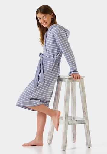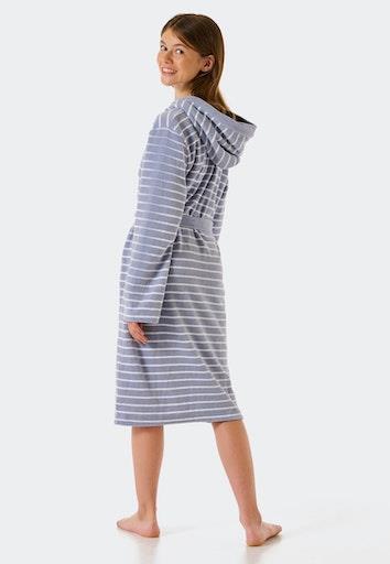 Otroški UNISEX črtast kopalni plašč s kapuco blagovne znamke SCHIESSER, z dvema žepoma na straneh, iz mehkega in udobnega frotirja, s priloženim pasom. Material: 80% bombaž, 20% poliester