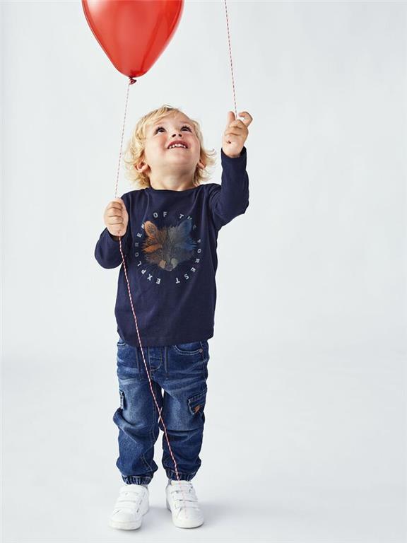 Otroška fantovska udobna majica z visokim deležem bombaža, z dekorativnim potiskom spredaj, regular kroj, dolg rokav. Material: 95% bombaž, 5% elastan
