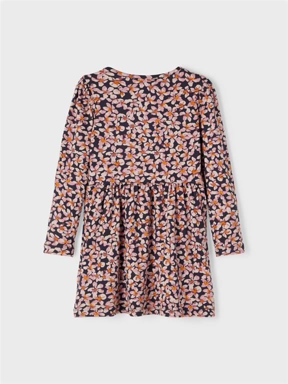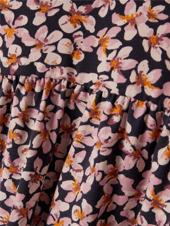 Otroška dekliška obleka z modnim all over vzorcem, iz mehkega in prijetnega materiala, z elastiko v pasu, rahlo nabran spodnji del, dolg rokav. Material: 97% poliester, 3% elastan