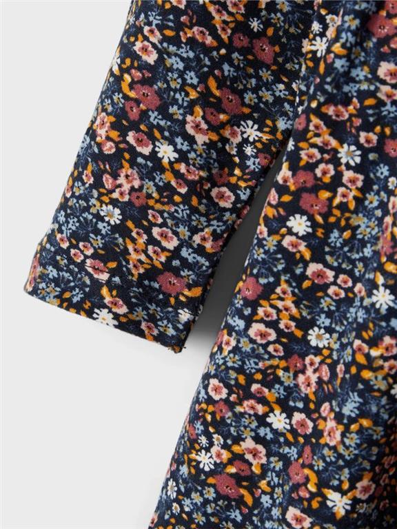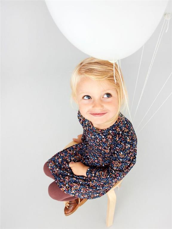 Otroška dekliška obleka z modnim all over vzorcem, iz mehkega in prijetnega materiala, z elastiko v pasu, rahlo nabran spodnji del, dolg rokav. Material: 97% poliester, 3% elastan