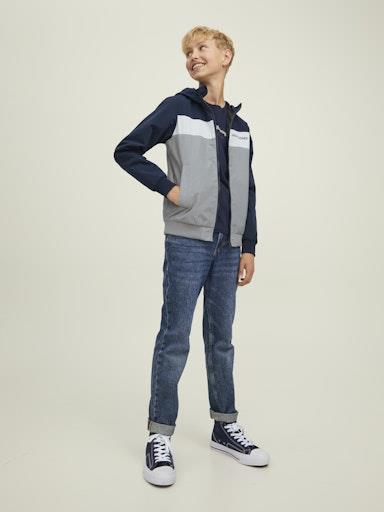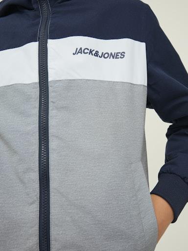 Otroška fantovska prehodna jakna - bomber blagovne znamke JACK&JONES JUNIOR, v modni večbarvni kombinaciji, z visokim ovratnikom in kapuco, z mehkim patentom za zaključkih, zapenjanje na zadrgo spredaj, z dvema žepoma spredaj, regular kroj. Material: 100% poliester