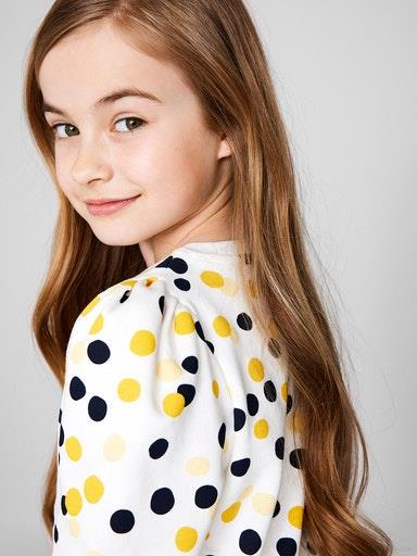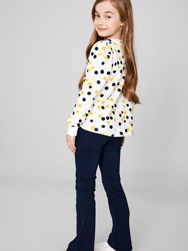 Otroški dekliški "trenirka" pulover z dekorativnim potiskom ali napisom, rahlo kosmaten material, patent na zaključkih, z rahlo nabranimi rokavi na ramenih, rahlo širši kroj, dolg rokav. Material: 100% bombaž