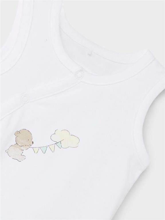 Otroški unisex body na preklop iz mehkega in udobnega ekološkega bombaža, s prikupnim potiskom spredaj, brez rokavov. Material: 95% ekološki bombaž, 5% elastan