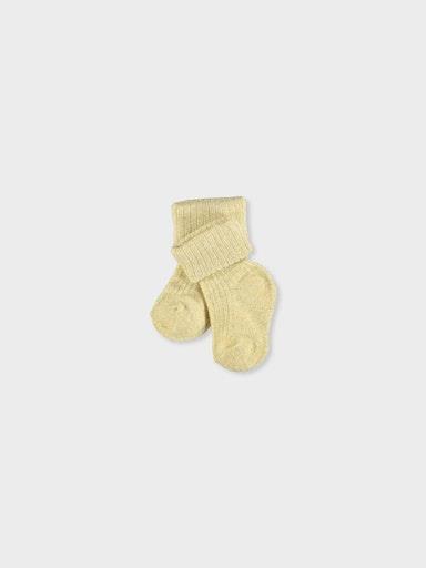 Otroške dekliške nogavičke z rebrastim vzorcem, z bleščečimi kovinskimi nitkami v blagu, z zavihkom. Material: 60% bombaž, 20% kovinska vlakna, 17% poliamid, 3% elastan