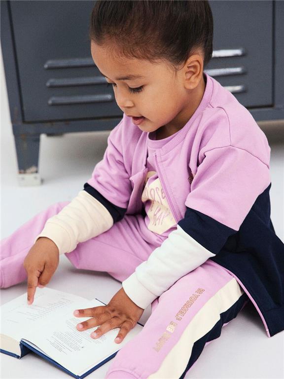 Otroška dekliška krajša jopa s kapuc v modni večbarvni kombinaciji, s potiskom spedaj, s patentom na zaključkih, zapenjanje na zadrgo, rahlo kosmaten material. Material: 95% bombaž, 5% elastan