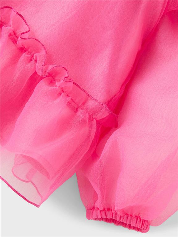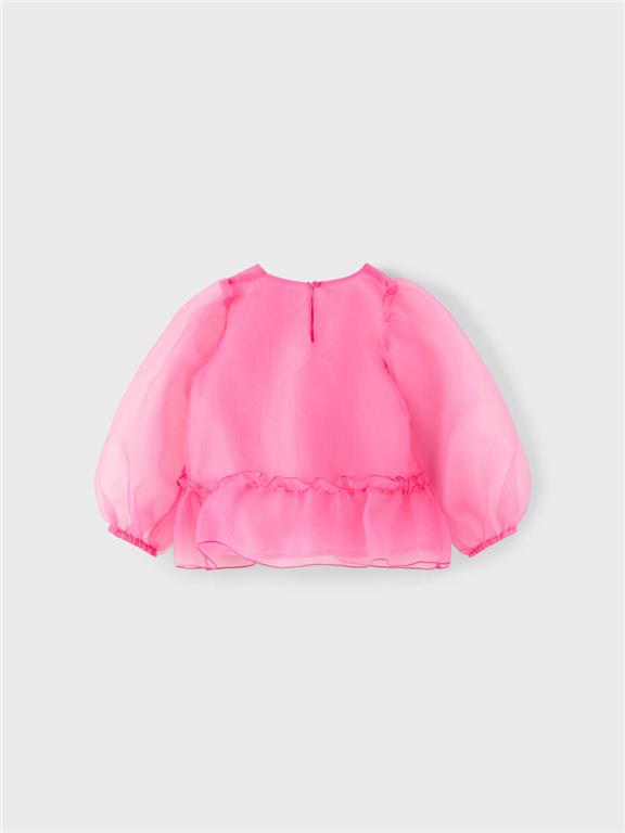 Otroška dekliška modna in elegantna bluza, z rahlo nabranim spodnjim delom, z mehko podlogo, s širokimi rokavi z elastiko na zaključkih, zapenjanje na gumb zadaj, regular kroj, 7/8 rokav. Material: 100% poliester; podloga: 100% poliester