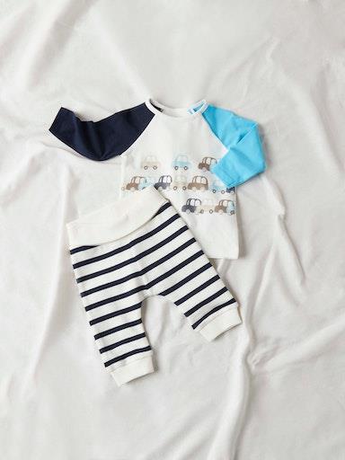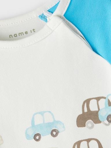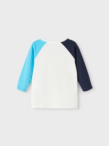 Otroška fantovska majica s prikupnim mehkim potiskom spredaj, z kontrastno obarvanimi rokavi, zapenjanje na rami s skritimi pritiskači, regular kroj, dolg rokav. Material: 95% ekološki bombaž, 5% elastan