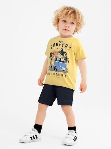 Otroška fantovska mehka in udobna majica z dekorativnim potiskom, regular kroj, z zavihki na rokavih, kratek rokav. Material: 95% bombaž, 5% elastan