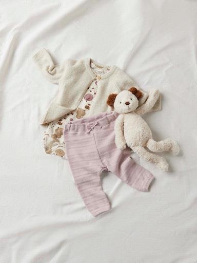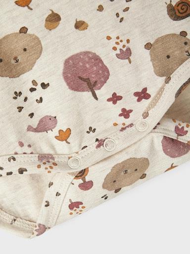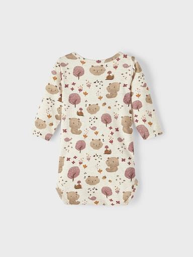 Otroški dekliški body s prikupnim all over vzorcem, zapenjanje na rami s skritimi pritiskači, dolg rokav. Material: 95% ekološki bombaž, 5% elastan.
