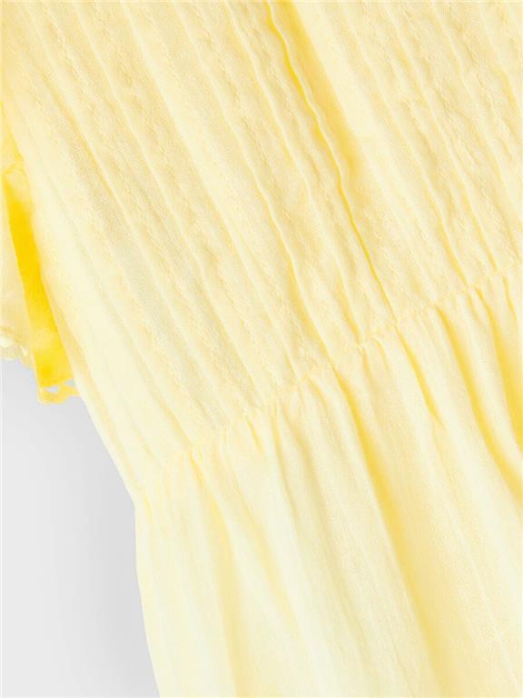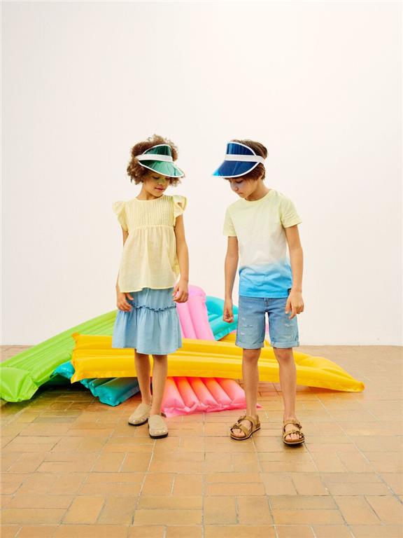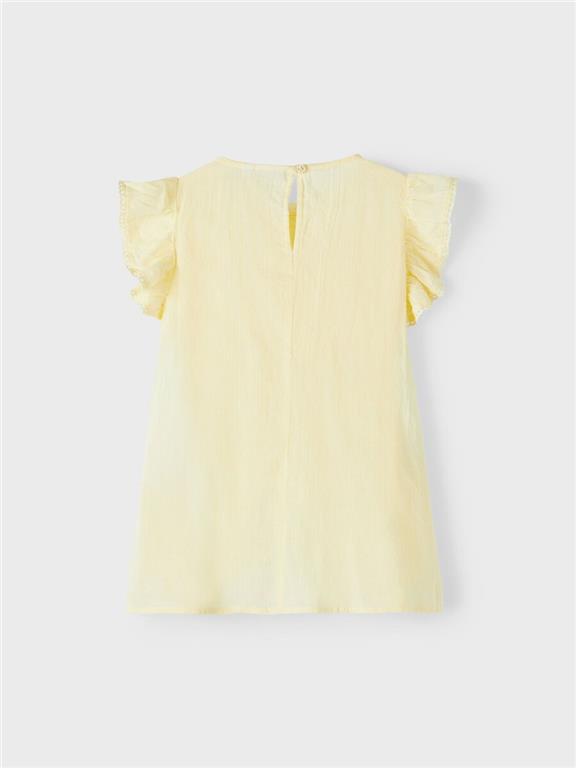 Otroška dekliška modna majica iz udobnega in tankega bombaža, z izvezenimi detajli na zgornjem delu, rahlo širši kroj, z volančki na rokavih, rahlo nabran spodnji del, zapenjanje z gumbom zadaj, kratek rokav. Material: 100% bombaž