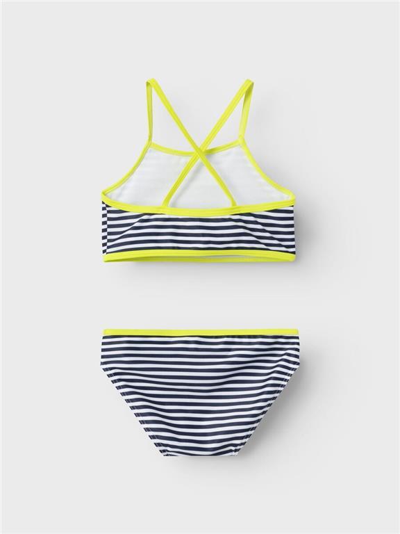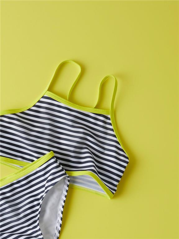 Otroške dekliške bikini kopalke s prekrižanimi naramnicami, z vzorcem, s klasičnimi slip hlačkami. Material: 84% recikliran poliester, 16% elastan; podloga: 100% poliester. Priporočljivo ročno pranje!