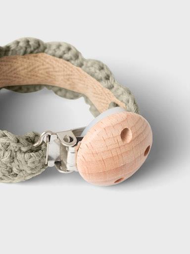 Otroška unisex obešanka za dudo, z izvzenim trakom in lesenim delom za pritrditev, obešanko za dudo z eno stranjo pritrdite na otrokovo oblačilo, na drugo stran pa nataknete dudo. Izdelek ni igrača, nujna je prisotnost staršev ali odraslih skrbnikov. Varnostno testirano in ustreza evropskim standardom EN12586:2007 + A1:2011. Material: 100% ekološki bombaž