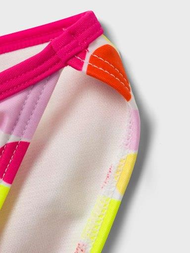 Otroške dekliške trikotne bikini kopalke z vzorcem, z nastavljivimi naramnicami za vratom in na hrbtni strani. Material: 84% recikliran poliester, 16% elastan; podloga: 100% poliester. Priporočljivo ročno pranje!