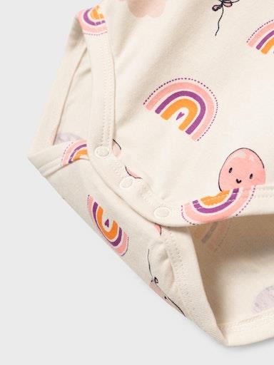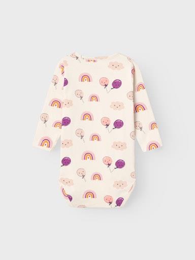 Otroški dekliški body s prikupnim all over vzorcem, zapenjanje na rami s skritimi pritiskači, dolg rokav. Material: 95% ekološki bombaž, 5% elastan.