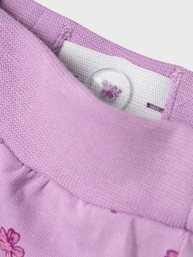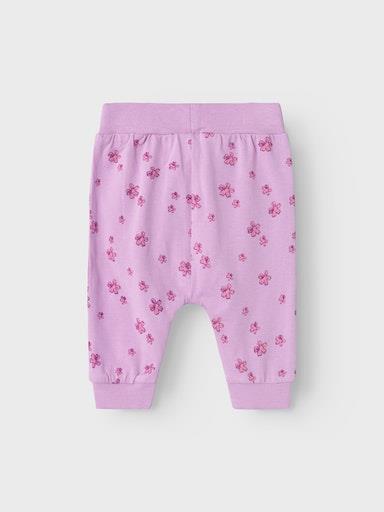 Otroške dekliške mehke in udobne hlače z all over vzorcem, z elastiko in vrvico v pasu, z mehkim patentom na zaključkih, regular kroj, nastavljiva širina pasu. Material: 95% ekološki bombaž, 5% elastan
