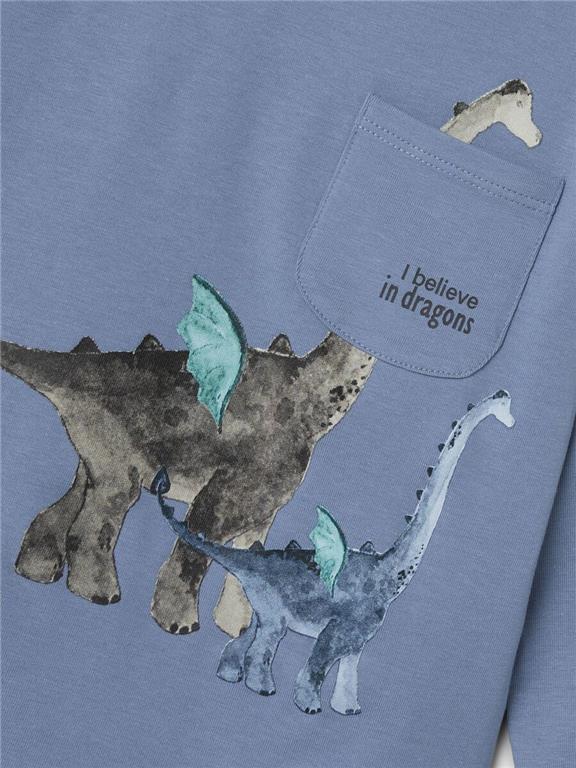 Otroška fantovska majica iz prijetnega in udobnega ekološkega bombaža, s kul potiskom z dinozavri in napisom spredaj, z žepom v višini prsi, regular kroj, dolg rokav. Material: 95% ekološki bombaž, 5% elastan