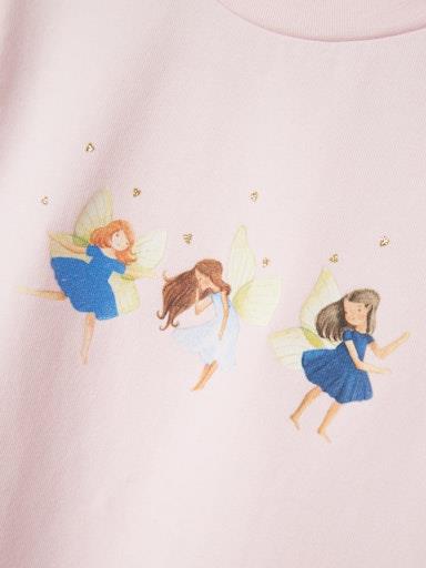 Otroška dekliška majica iz udobnega in prijetega ekološkega bombaža, s prikupnim potiskom spredaj, z bleščičastimi detajli, regular kroj, dolg rokav. Material: 95% ekološki bombaž, 5% elastan