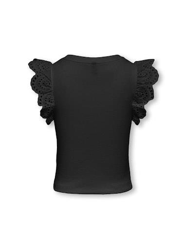 Otroška dekliška modna majica blagovne znamke KIDS ONLY, iz prijetnega rebrastega materiala, z volančki na rokavih, z luknjičastim vzorcem, oprijet kroj, kratek rokav. Material: 95% bombaž, 5% elastan