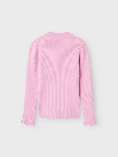 Otroški dekliški pulover iz fine in mehke pletenine, rebrasta struktura, z valovitimi zaključki na rokavih, z rahlo spuščenimi rameni, slim kroj, dolg rokav. Material: 51% LENZING™ ECOVERO™ viskoza, 29% poliester, 20% najlon