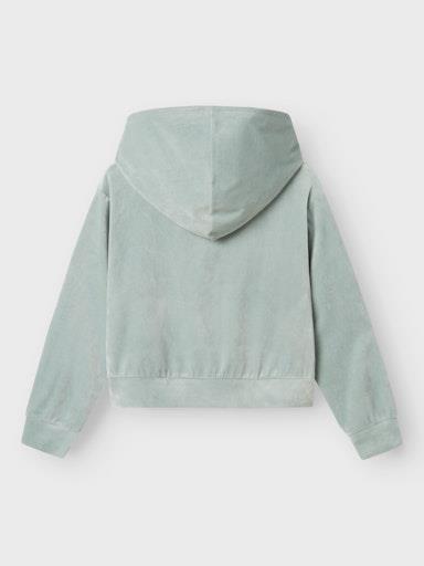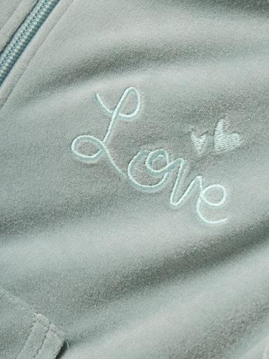 Otroška dekliška modna jopa s kapuco iz mekhega in udobnega velurja, z izvezenim detajlom spredaj, z mehkim patentom na zaključkih, s "kenguru" žepom spredaj, zapenjanje z zadrgo, rahlo krajši kroj. Material: 65% recikliran poliester, 30% poliester, 5% elastan