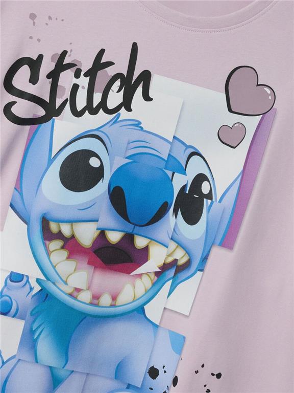 Otroška dekliška modna majica z licenčnim potiskom priljubljenega Stitch-a spredaj, rahlo širši in krajši kroj, kratek rokav. Material: 95% bombaž, 5% elastan