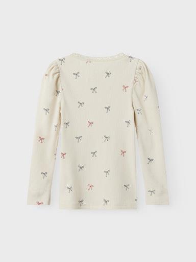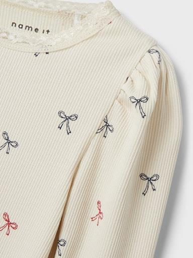Otroška dekliška modna in udobna majica, iz prijetnega rebrastega materiala, z čipko na ovratniku, z all over potiskom, dolg rokav. Material: 95% ekološki bombaž, 5% elastan