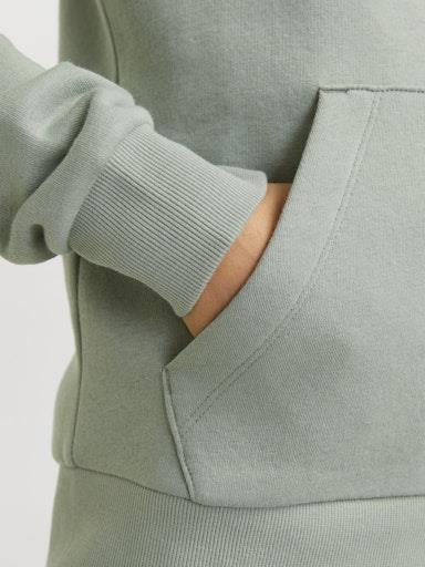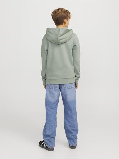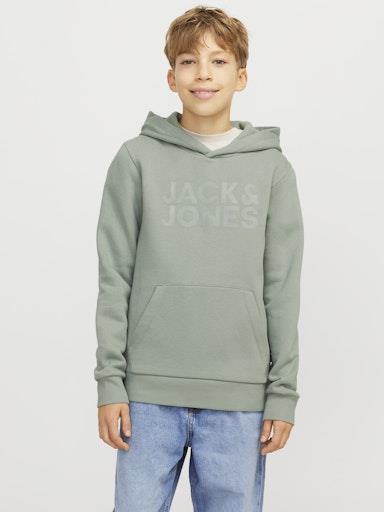 Otroški fantovski moden in udoben pulover s kapuco blagovne znamke JACK & JONES JUNIOR, rahlo kosmaten material, z logotiopm spredaj, s patentom na zaključkih, "kenguru" žep spredaj, dolg rokav. Material: 70% bombaž, 30% poliester