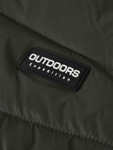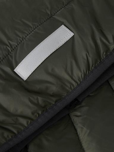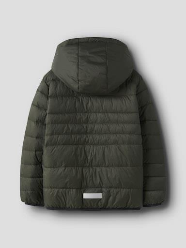 Otroška fantovska prešita jakna z odstranljivo kapuco, z odsevnim elementom zadaj, s tanko podlogo in polnilom, z dekorativnim našitkom spredaj. Zapenjanje z zadrgo, dva žepa na straneh, mehka elastika na rokavih. Material: zunaj: 100% recikliran najlon, podloga: 100% poliester, polnilo: 100% recikliran poliester