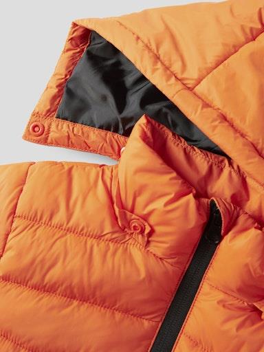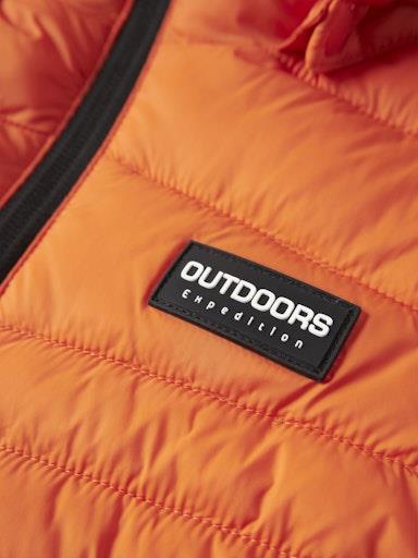 Otroška fantovska prešita jakna z odstranljivo kapuco, z odsevnim elementom zadaj, s tanko podlogo in polnilom, z dekorativnim našitkom spredaj. Zapenjanje z zadrgo, dva žepa na straneh, mehka elastika na rokavih. Material: zunaj: 100% recikliran najlon, podloga: 100% poliester, polnilo: 100% recikliran poliester