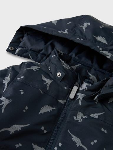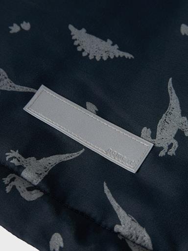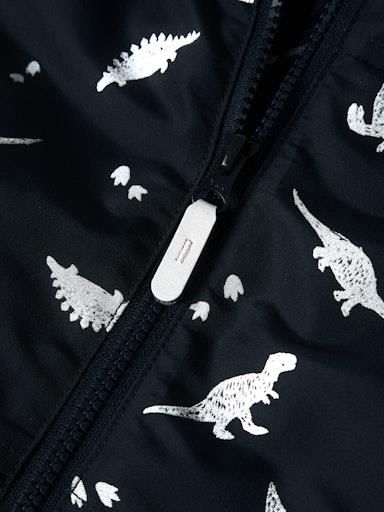 Otroška fantovska zimska jakna z all-over vzorcem dinozavrov, ki so hkrati odsevni elementi, z odstranljivo kapuco in odsevnimi elementi spredaj in zadaj. Zapenjanje z zadrgo, dva žepa, mehak patent na rokavih, z elastiko na hrbtni strani. Material: 100% recikliran poliester; podloga: 100% poliester, polnilo: 100% poliester