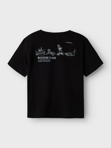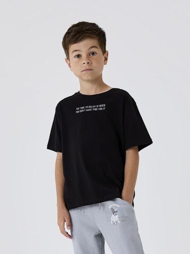 Otroška fantovska modna majica iz prijetnega ekološkega bombaža, s potiskom spredaj, črna tudi s potiskom zadaj, rahlo širši kroj, kratek rokav. Material: 80% ekološki bombaž, 20% recikliran bombaž