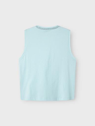 Otroška fantovska majica iz prijetnega in udobnega ekološkega bombaža, s poletnim potiskom spredaj, rahlo širši in krajši kroj, brez rokavov. Material: 100% ekološki bombaž