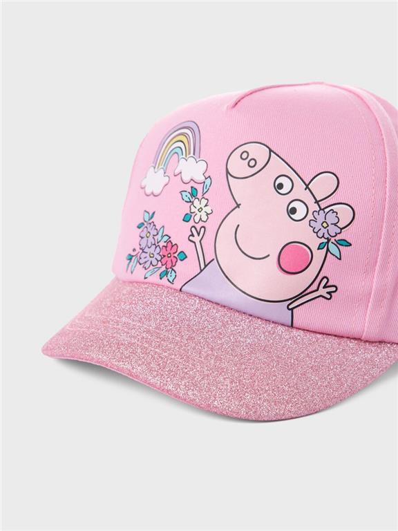 Otroška dekliška kapa s šiltom z licenčnim potiskom iz priljubljene risanke Pujsa Pepa, z bleščicami na šiltu, zapenjanje na ježka zadaj. Material: 100% bombaž. Velikosti: 50/51: 2–4 leta, 51/52: 5–7 let, 52/53: 7-9 let,
