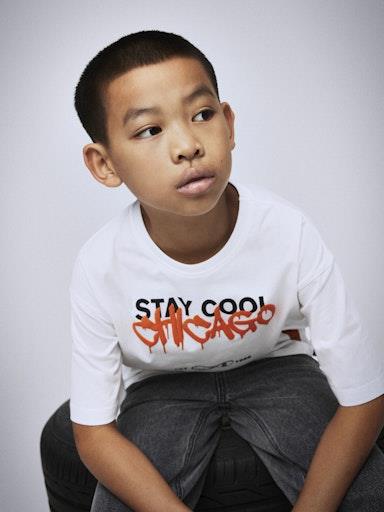 Otroška fantovska majica iz prijetnega ekološkega bombaža, s potiskom spredaj, rahlo širši in krajši kroj, kratek rokav. Material: 100% ekološki bombaž