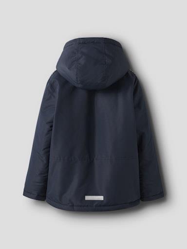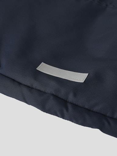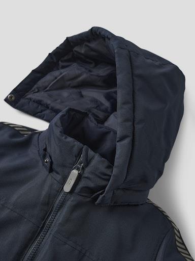 Otroška fantovska zimska jakna z odstranljivo kapuco in odsevnim elementom zadaj ter na obesku na zadrgi, z dekorativnim trakom vzdolž rokava, zapenjanje z zadrgo, z dvema žepoma spredaj, mehak patent na rokavih. Material: 100% recikliran poliester; podloga: 100% poliester; polnilo: 100% poliester