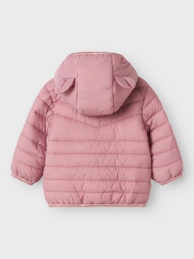Otroška dekliška prehodna prešita jakna s kapuco, z mehko elastiko na zaključkih, zapenjanje z zadrgo spredaj, z dvema žepoma spredaj, z dekorativnima ušeskoma na kapuci, regular kroj. Material: zunaj; 100% recikliran najlon; podloga: 100% poliester; polnilo: 100% recikliran poliester
