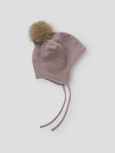 Otroška dekliška kapa z velikim deležem prijetne Merino volne, z dekorativnim cofom iz umetnega krzna, s podaljšanim delom pri ušesih, zavezovanje s trakovi. Material: 52% Merino volna, 41% bombaž, 7% poliamid