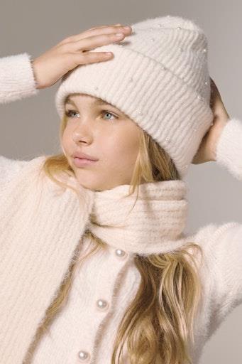 Otroška dekliška modna zimska kapa blagovne znamke KIDS ONLY, z zavihkom, z dekorativnimi biserčki spredaj, univerzalna velikost. Material: 95% recikliran poliester, 3% elastan, 2% poliester