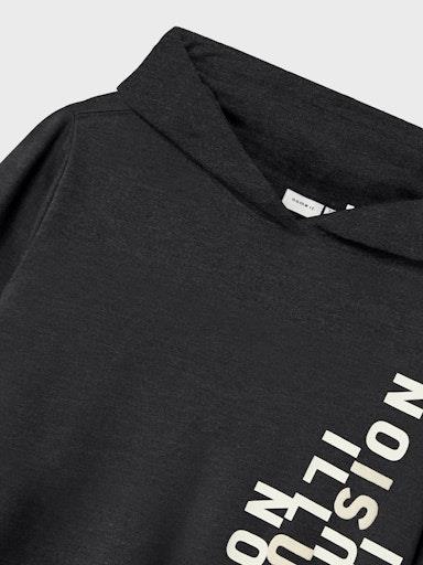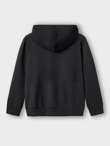Otroški fantovski pulover s kapuco, z mehkim rebrastim patentom na zaključkih, s potiskom spredaj in zadaj, kosmaten material, rahlo širši kroj, dolg rokav. Material: 60% bombaž, 40% poliester