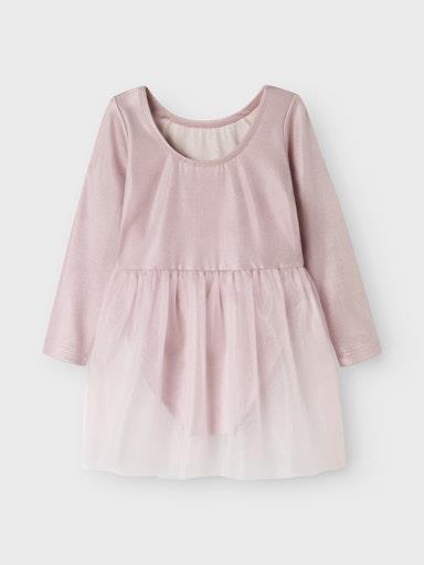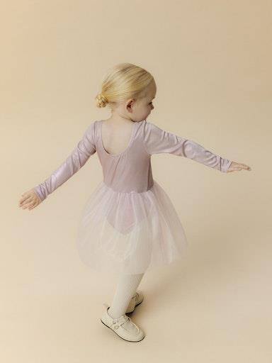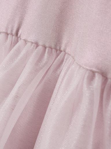 Otroška dekliška obleka iz mehkega tila, narejena kot dres, zgornji del se nadaljuje v body spodaj, z krilom iz tila, svetleč material, dolg rokav. Material: 97% poliester, 3% elastan