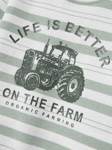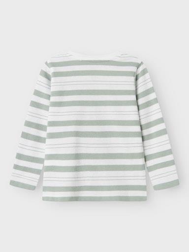 Otroška fantovska modna majica iz prijetnega ekološkega bombaža, s potiskom spredaj, z črtastim all over vzorcem, iz prijetnega strukturiranega materiala, rahlo širši in krajši kroj, dolg rokav. Material: 60% ekološki bombaž, 40% recikliran poliester