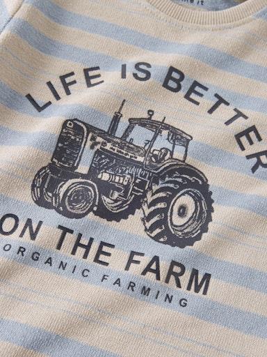 Otroška fantovska modna majica iz prijetnega ekološkega bombaža, s potiskom spredaj, z črtastim all over vzorcem, iz prijetnega strukturiranega materiala, rahlo širši in krajši kroj, dolg rokav. Material: 60% ekološki bombaž, 40% recikliran poliester